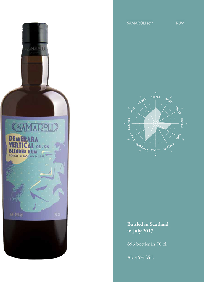 This rum brings together a selection of Demerara’s molasses rums. The 2017 edition was bottled in Scotland by Samaroli and is the second release from the Vertical 03 - 04 blend. Demerara rums are rooted in Guyana’s long-established rum-making heritage, where producers focus on structured, full-bodied molasses distillates built for complexity over time.