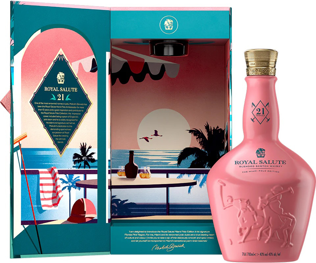 Royal Salute 21 Year Old "Miami Polo Edition" is the sixth release in the Polo Collection, designed to celebrate Miami's polo heritage and the city's vibes. It is the first Royal Salute whisky that is fully finished in first-fill rye and first-fill bourbon casks. These two American oak casks allow the blend to draw on the bold richness of bourbon and the gentle spiciness of rye. The bottle's design echoes Miami's visual language, featuring a striking pink hue and Art Deco styling that reflect the city's architecture.
